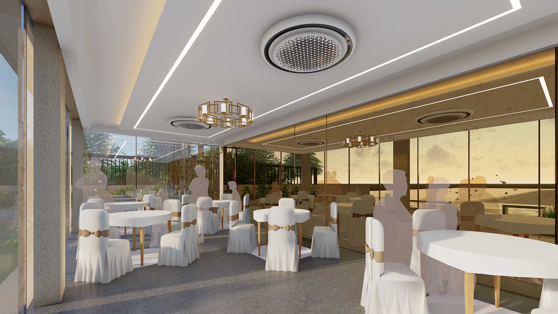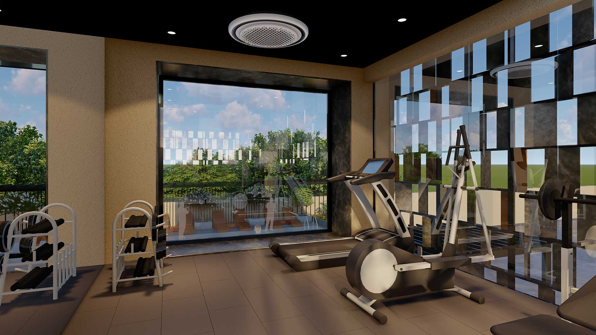 The 25-seater multipurpose hall was created with a minimalistic design goal, utilizing full height mirror walls, natural Kota stone, and other materials. Full-size sliding doors have been installed in the hall to visually connect the interior and exterior spaces while also extending the area available for public gatherings. The gym on the top floor utilizes the same materials, and the jaali pattern’s shimmering effect on the exterior emphasizes to its beauty while also enhancing its form and function