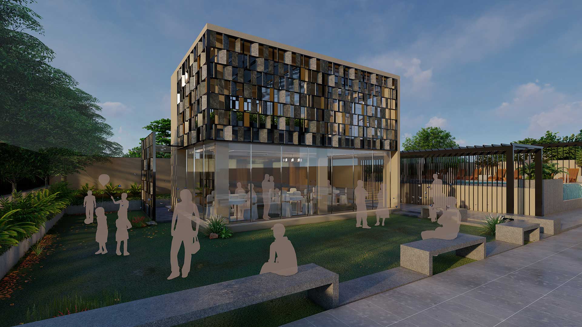 The opulent club house, which was built as a component of a high-end housing project, commands a conspicuous spot at the fore of the development. The club has a commendable swimming pool, a multipurpose hall on the ground floor, a gym, and other amenities on the upper floor. The main objective was to create the club house such that it could be perceived well from the nearby road without going beyond the permitted height. The building’s interiors needed a subdued design strategy, whereas the exterior design called for highlighting elements.